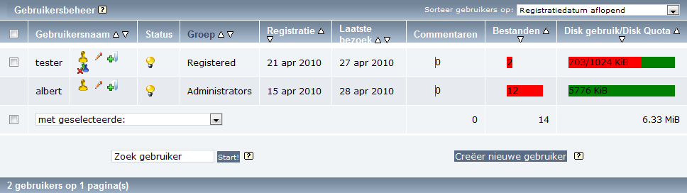 The "Space used" column shows how much of the space that is assigned to the user has already been used. The total space the user is allowed to have ("Space Quota") depends on the user's group - which you set in the groups panel.
